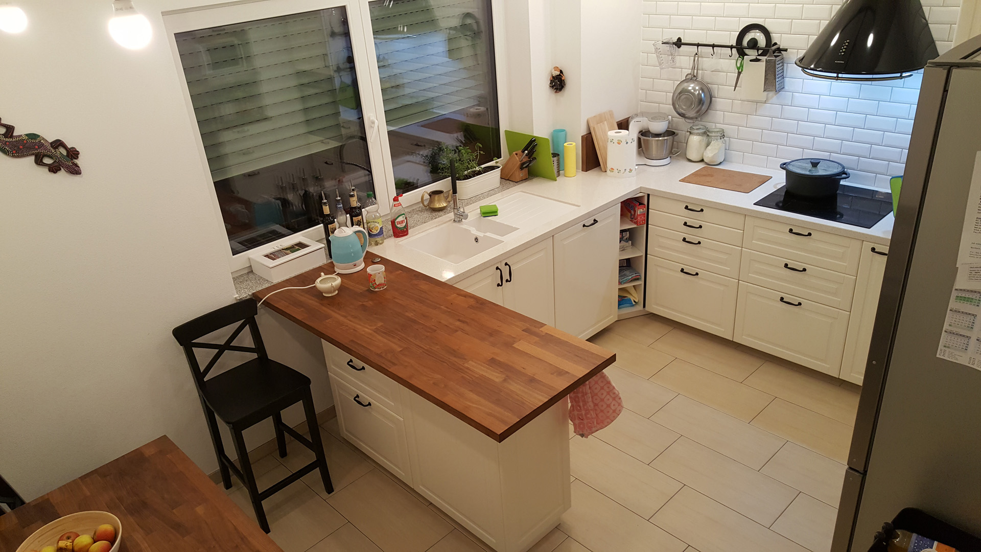 Проектировать кухню я стала на следующий день после подписания договора купли-продажи дома. Площадь нашей кухни порядка 12 квадратов, с большим окном напротив двери и водопроводным выводом под ним. В день когда мы въехали, кухня выглядела вот так: