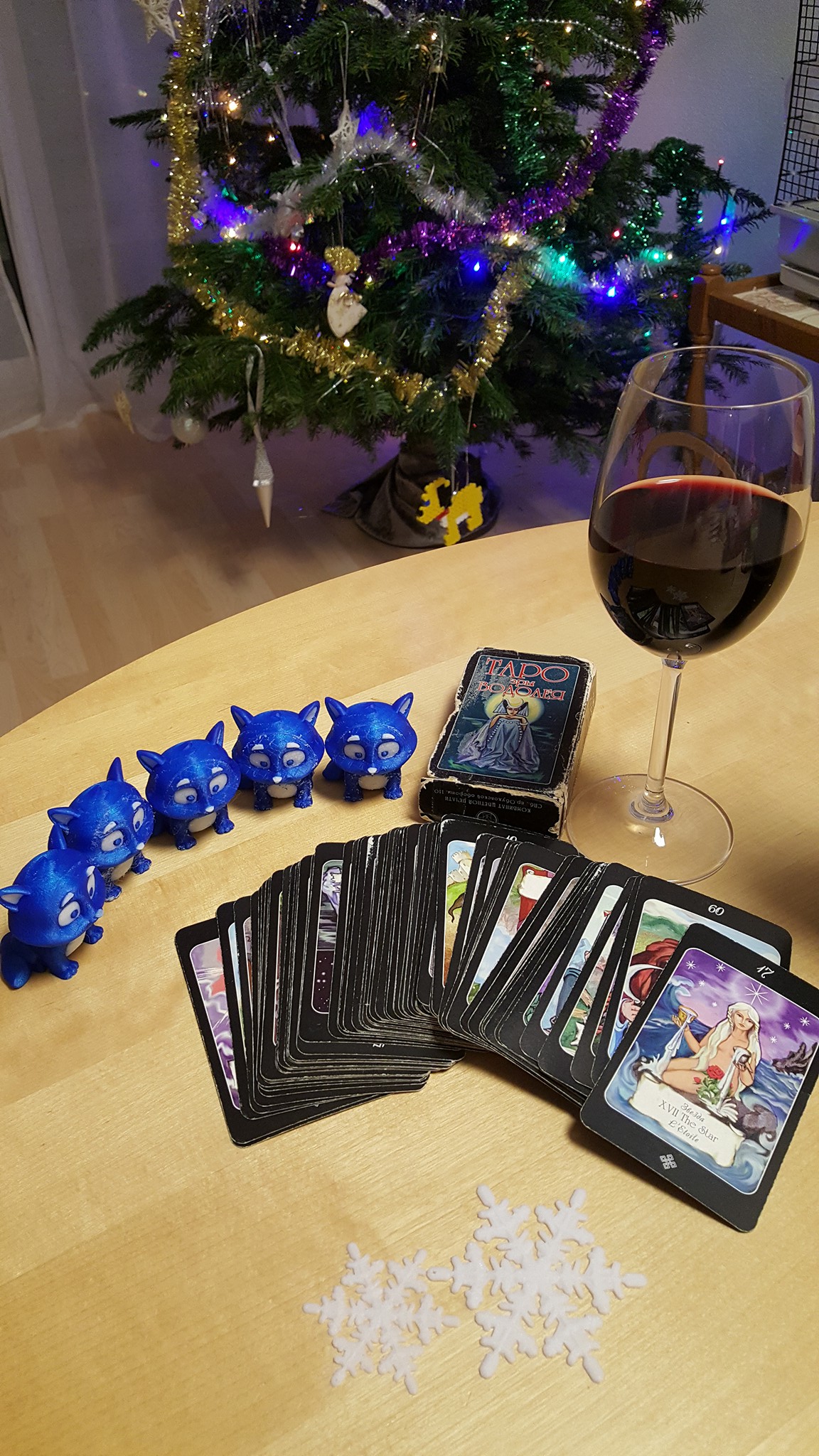 И поэтому я объявляю новогодние гадания! Кто хочет получить мудрый совет от моих почти старинных 18-летних карт Таро, прошу в комменты. Сформулируйте в голове вопрос, потом напишите номер карты и на какую тему надо дать ответ. На тему любви, работы или общего душевного состояния. 🙂 Обещаю честно отсчитывать номер карты с верха колоды, постить фото карты и что она обещает. Потом карту буду класть в конец колоды. Карт 78 штук.